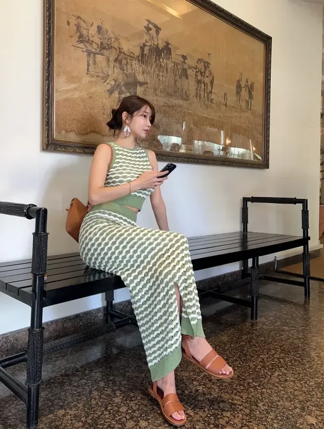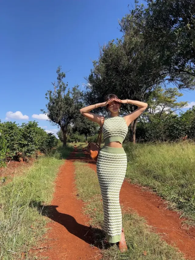 인플루언서 오또맘이 케냐 여행 2일차를 맞아 대자연의 색감과 조화를 이루는 감각적인 사파리 여행 패션을 선보였다. 이번 스타일링은 야생의 거친 질감과 대비되는 부드러운 소재감을 활용해 실용성과 심미성을 동시에 확보한 것이 특징이다. 오또맘은 화이트와 그린 컬러가 교차하는 물결 패턴의 크로셰 셋업을 착용했다. 민소매 크롭 톱과 슬릿 디테일이 들어간 맥시 스커트의 조합은 통기성이 좋아 열대 기후에 적합하며, 입체적인 조직감은 야외 활동 시 시각적인 풍성함을 더한다.