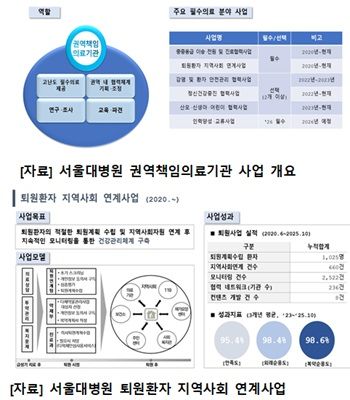 서울대병원은 ‘퇴원환자 지역사회 연계사업’을 통해 보건소·주민센터·재가요양센터 등 236개 기관과 협력하며, 퇴원환자가 지역사회에서 지속적인 관리를 받을 수 있는 환경을 마련하고 있다.