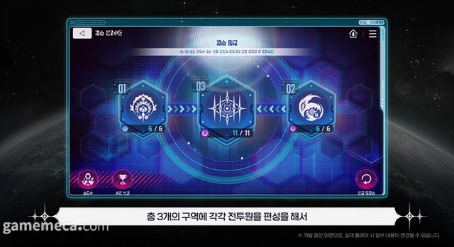 3개 덱을 쓰는 콘텐츠도 등장한다. 해킹된 시스템을 정화해나가는 '정화 프로토콜'이다. 최승현 팀장은 "총 3개 구역에 각각 전투원을 편성한다. 지금까지와 다르게 위험이 닥쳤을 때 외부에 도움을 요청할 수 있는데 일레인에게 백신 코드 지원 요청을 해서 지정된 버프 효과를 받을 수 있다"라고 말했다. 아울러 이 콘텐츠에서는 스테이지 클리어 후에도 스트레스 수치가 유지되기에 전투원이 붕괴 상태에 빠질 가능성도 높아진다.