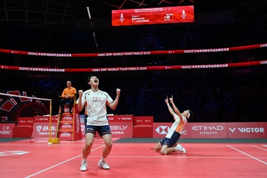 서승재-김원호 조는 이날 월드투어 파이널 우승을 확정지은 뒤 왼쪽과 오른쪽의 검지 손가락을 하나씩 들어올리는 세리머니로 올해 11관왕을 자축했다.