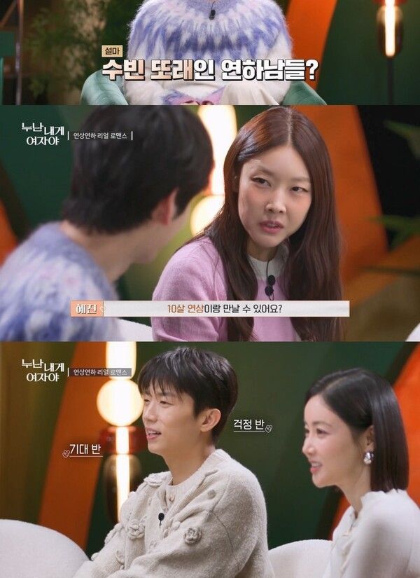 한혜진과 황우슬혜는 “다들 몇 살일까…수빈 씨 또래일까?”라며 연하남들이 2000년생 수빈과 비슷할 것이라 추측했고, 수빈 또한 “연하남들을 30대 초반으로 생각했는데…제 또래일 것 같다”고 조심스레 예상했다. 실제 나이 공개 결과, 장우영은 황우슬혜보다 정확히 10살 연하로 밝혀져 관심을 모았다. 이에 장우영과 수빈이 어떤 답을 내놨는지는 본 방송에서 확인할 수 있다.
