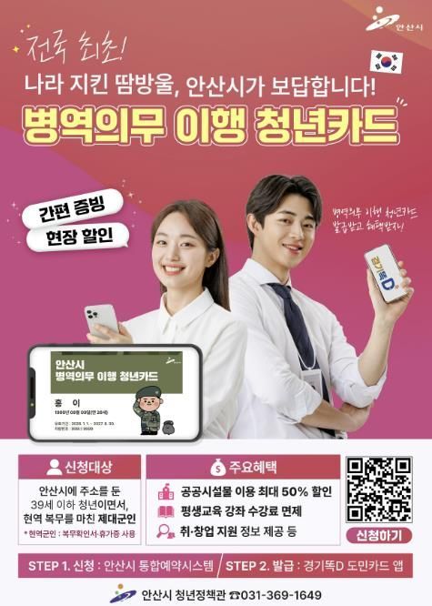 청년카드 발급 대상은 안산시에 주민등록이 되어있는 39세 이하 청년 가운데 현역 복무를 마친 의무·중기·장기 복무 제대군인이다. 신청은 ‘안산시통합예약시스템’을 통해 온라인으로 간편하게 접수할 수 있다. 현역 복무 중인 경우, 복무확인서 또는 휴가증을 사용해 동일한 혜택을 받을 수 있다.
