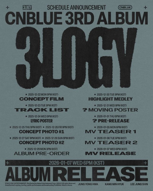 씨엔블루의 정규 3집 ‘쓰릴로지’는 1월 7일 오후 6시 각종 음원 사이트를 통해 발매된다. 이들은 1월 17~18일 양일간 서울에서 2026 씨엔블루 라이브 ‘쓰릴로지’를 개최하고 새 월드 투어의 포문을 연다.