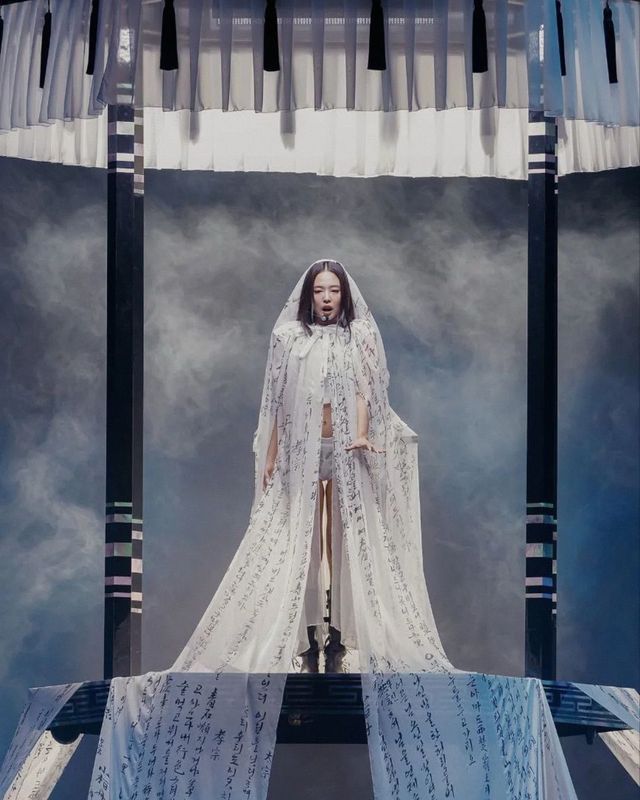 시작은 〈Seoul City〉였습니다. 몽환적으로 울려 퍼지는 음악과 함께 무대 위에 드리워진 건 다름 아닌 약 15미터에 달하는 베일이었죠. 베일에는 한글로 기록된 최초의 노래 가사집 『청구영언』의 구절이 새겨져 있었습니다. 단순히 얼굴을 가리기 위한 액세서리가 아닌, 자신의 기원과 마주하는 장면을 극적으로 시각화한 장치였죠. 여기에 반가사유상 복식에서 영감을 받은 구조적인 어깨 라인의 가운과 장인의 손길이 깃든 병아리 매듭 노리개를 더해 고요하면서도 단단한 아름다움을 표현했습니다. 저고리 형태에서 착안해 현대적으로 재해석한 제니와 댄서들의 의상은 무대 전반에 한국적인 미학을 한가득 수놓았고요.