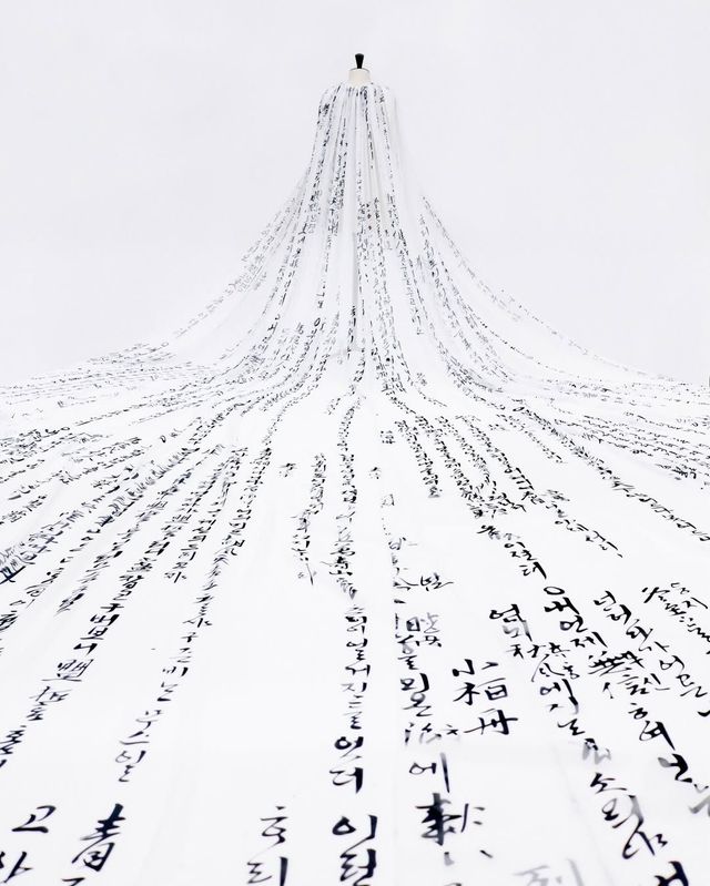 한 폭의 그림을 연상케 하는 드레스는 모두 르쥬의 작품입니다. 앞서제니의 'ZEN' 뮤직비디오 속 커스텀 의상으로 한국의 미를 널리 알린 브랜드죠. 주목할 점은 이 모든 의상이 철저한 수작업과 장인정신에 기반해 완성됐다는 사실입니다. 약 200시간에 걸쳐 금박장으로 새긴 2,000여 개의 ‘제니’라는 이름과 얇은 사의 결을 살리기 위한 수작업은 동시대의 가장 뜨거운 아이콘, 제니를 만나 마침내 또렷한 의미를 얻었습니다. 이보다 극적인 전통과 K-팝의 만남이 또 있을까요?
