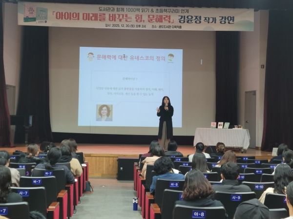 김윤정 작가는 강연을 통해 문해력의 개념과 의미, 문해력이 왜 미래 사회의 핵심 역량이자 ‘미래 권력’으로 주목받고 있는지, 최근 아동, 청소년의 문해력이 저하되고 있는 사회적, 환경적 요인에 대해 이야기했다. 특히 문해력의 기초는 독서에 있으며 올바른 책 읽기가 사고력, 이해력, 표현력은 물론 아이의 전반적인 학습 능력과 삶의 태도까지 형성하는 중요한 밑바탕이 된다고 강조했다.