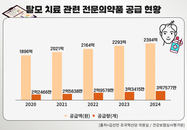 17일 국회 보건복지위원회 소속 김선민 조국혁신당 의원이 건강보험심사평가원으로부터 받은 자료에 따르면 탈모 치료에 사용되는 전문의약품 공급액은 2020년 1896억원에서 2024년 2394억원으로 5년간 약 26% 증가했다. 이는 약국과 병·의원에 공급된 탈모 치료 전문의약품 금액을 기준으로 한 수치다. 같은 기간 탈모 치료제 공급량도 2020년 2억2466만개에서 2024년 3억7577만개로 늘어 약 67% 증가하는 등 공급액과 공급량 모두 2020년 이후 증가세를 이어가고 있다.