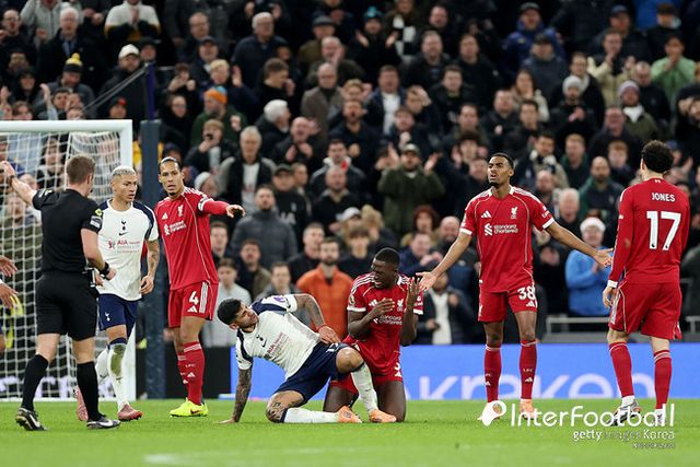 토트넘은 이른 시간 악재를 맞았다. 전반 33분 사비 시몬스가 레드카드를 받아버린 것. 시몬스는 전방 압박을 하는 과정에 버질 반 다이크를 밟았다. 주심은 처음에는 경고를 줬지만, 비디오 판독(VAR) 끝에 다이렉트 퇴장으로 판정을 바꿨다. 수적 열세 속 토트넘은 리버풀에 밀리기 시작했다.