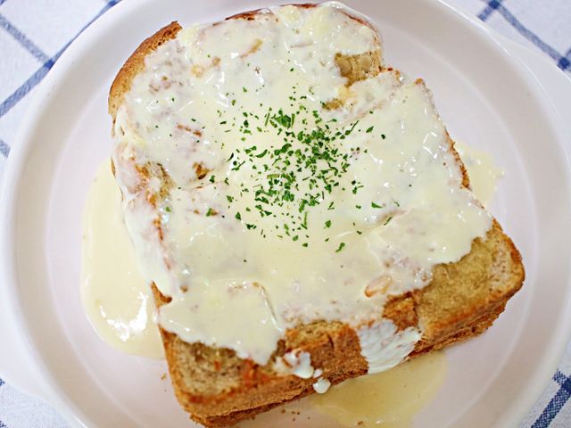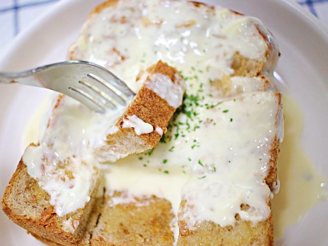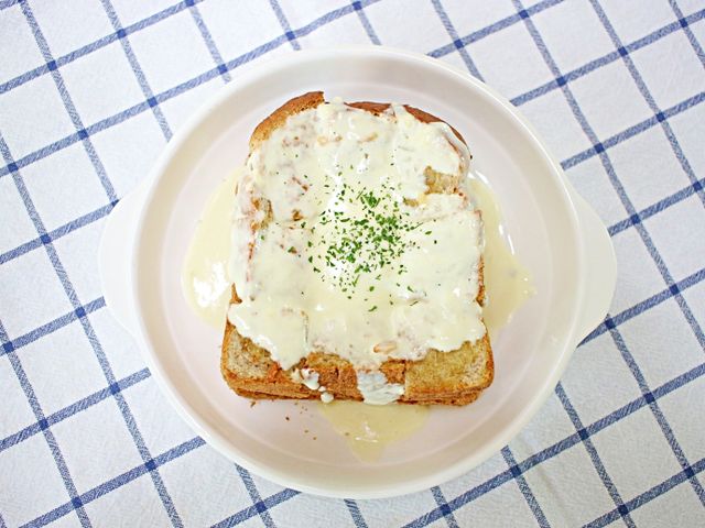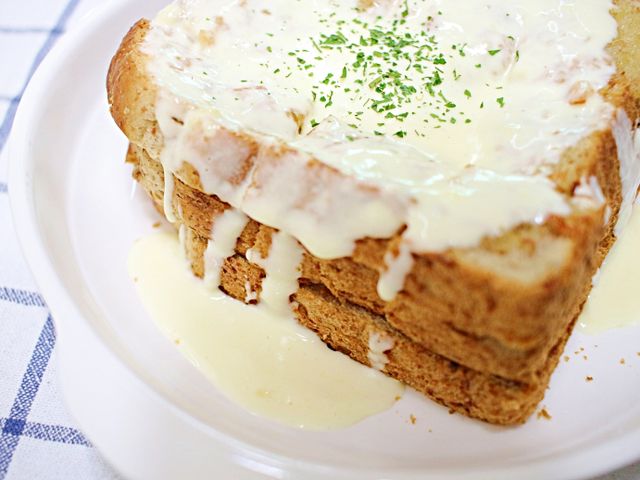 식빵 탑 위에 크림소스 뿌리면