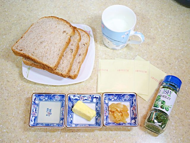 재료는 식빵, 슬라이스치즈, 우유, 버터, 꿀, 다진마늘 준비했어요.