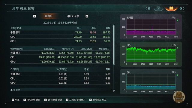 ▲ PALIT RTX 5060 DUAL OC 8GB DLSS 미적용(TAA) 결과. 평균 74.49 프레임이다. 최소 프레임은 49.59프레임이라 풀옵션에서 평균 60프레임 방어는 쉽지 않다.