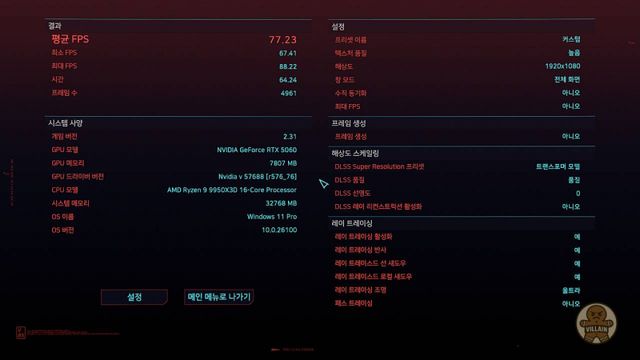 | RTX 5060 | TAA (DLSS 미적용) | 74.49 | 49.59 | 197.75 | DLSS 미적용 시 FHD 75 프레임 정도로 유지 |
