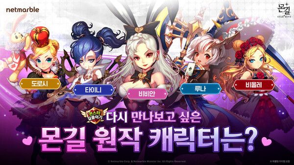 '몬스터 길들이기' 원작에서 큰 사랑을 받았던 도로시, 루나, 비비안, 비올레, 타이니 등 다섯 캐릭터를 대상으로 한 이용자 설문조사를 발표했다. 이 PD는 앞선 '지스타 2025' 현장에서 원작 캐릭터 구현에 대한 이용자들의 의견을 듣겠다고 약속한 바 있다.