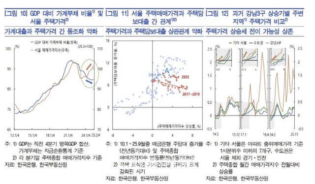 한은 금융안정국은 “최근 가계부채 증가세 둔화에도 서울 주택가격 상승세는 지속되는 등 과거 상호 간에 유사하게 움직여왔던 가계대출과 주택가격 간의 관계가 약화되는 모습”이라면서 “주택가격 상승세가 규제지역 외 여타 지역으로 전이될 경우 차입 제약이 적은 지역을 중심으로 가계부채 증가세가 다시 커질 가능성을 배제할 수 없다”고 짚었다.