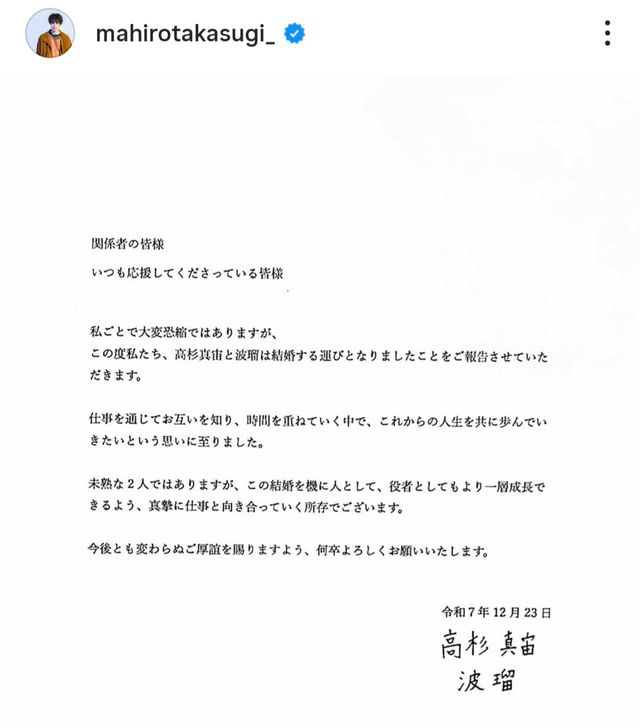 타카스기 마히로와 하루는 23일 각자의 공식 계정을 통해 “이번에 저희 타카스기 마히로와 하루는 결혼하게 되어 알린다”고 결혼 소식을 공식 발표했다.
