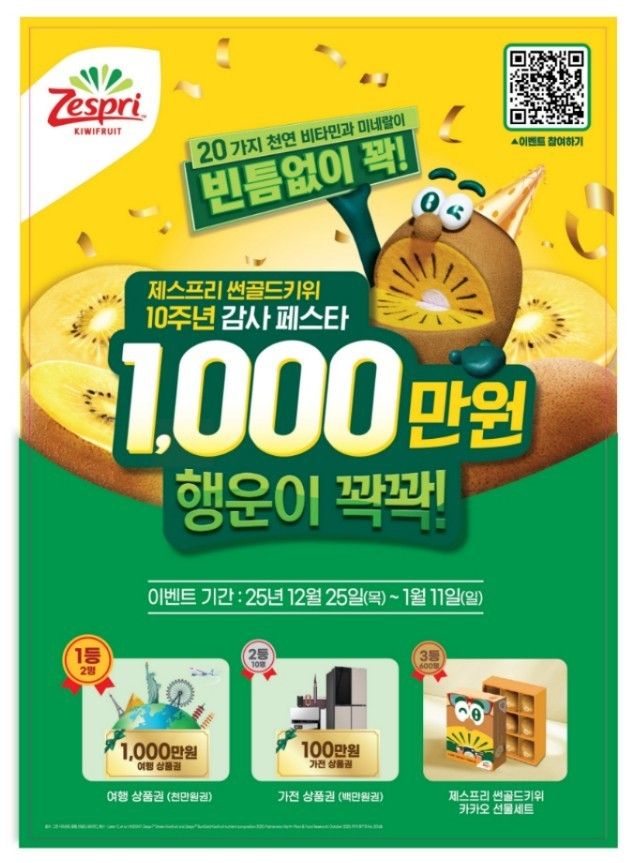 참여 방법은 간단하다. 전국 온·오프라인 매장에서 썬골드키위를 구매한 뒤, 패키지에 부착된 QR 코드를 통해 이벤트 전용 모바일 페이지에 접속한다. 해당 페이지에서 개인정보를 입력하고 ‘응모하기’ 버튼을 누르면 자동으로 추첨 대상에 포함된다.