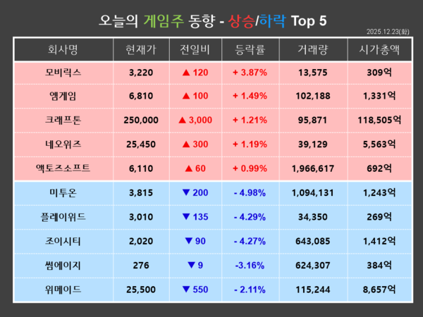 반면, 미투온은 금일(23일) 전거래일 대비 4.98%(200원) 하락한 3,815원에 장을 마감했다. 개인이 111,120주를 순매수한 반면, 기관과 외국인이 각각 34,762주, 75,618주를 순매도하며 장 초반부터 하락해 약세로 마쳤다.