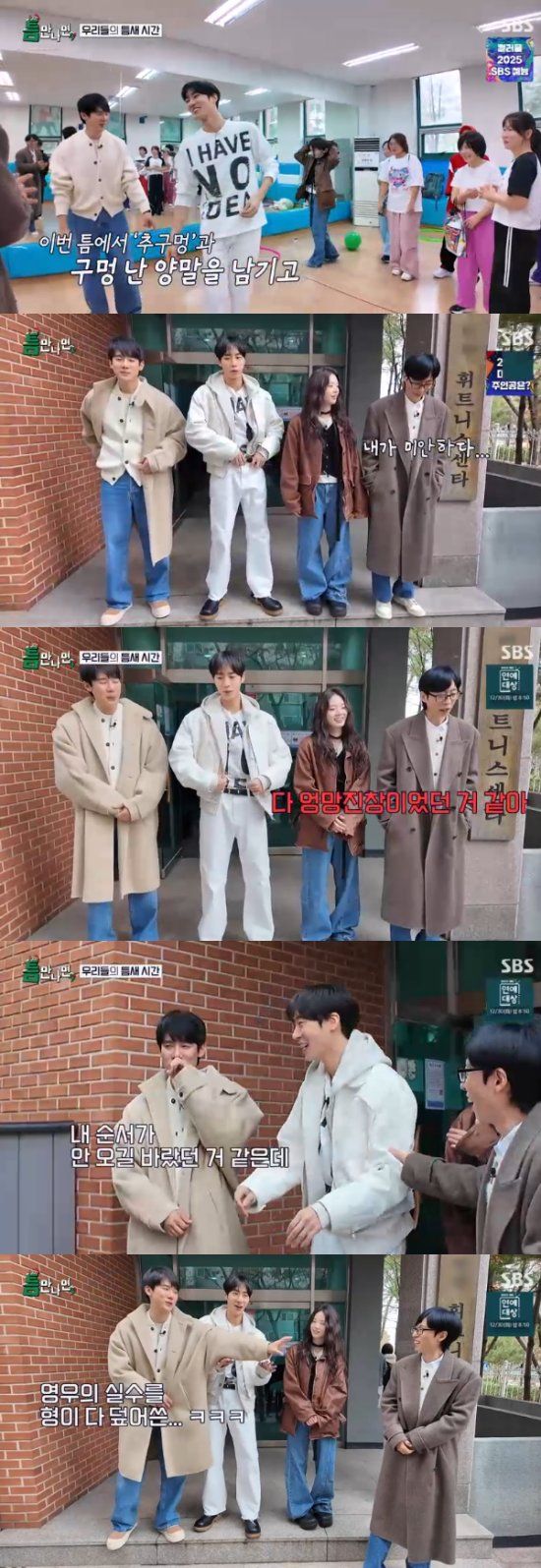 이에 추영우는 "긴장하고 있다가..."라고 답하면서 웃음을 감추지 못했고, 유연석은 "영우의 실수를 재석이 형이 다 뒤집어썼다"고 놀려 웃음을 줬다.