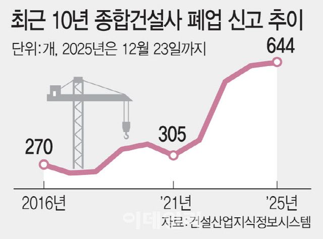 23일 건설산업지식정보시스템에 따르면 이날 기준 올해 종합건설업 폐업 수는 644건으로 지난해(641건)폐업 수를 뛰어넘으며 관련 통계 집계가 시작된 이후 역대 최고치를 기록했다. 건설업 전체 폐업은 3466건으로 지난해(3675건)와 비슷한 수준을 기록할 것으로 예측된다.