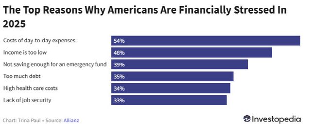 23일(현지시간) 미국 투자 전문 매체 인베스토피아에 따르면 생명보험사 알리안츠가 실시한 설문조사 결과, 미국인의 48%가 “2025년 초보다 현재 더 많은 재정 스트레스를 받고 있다”고 답했다.