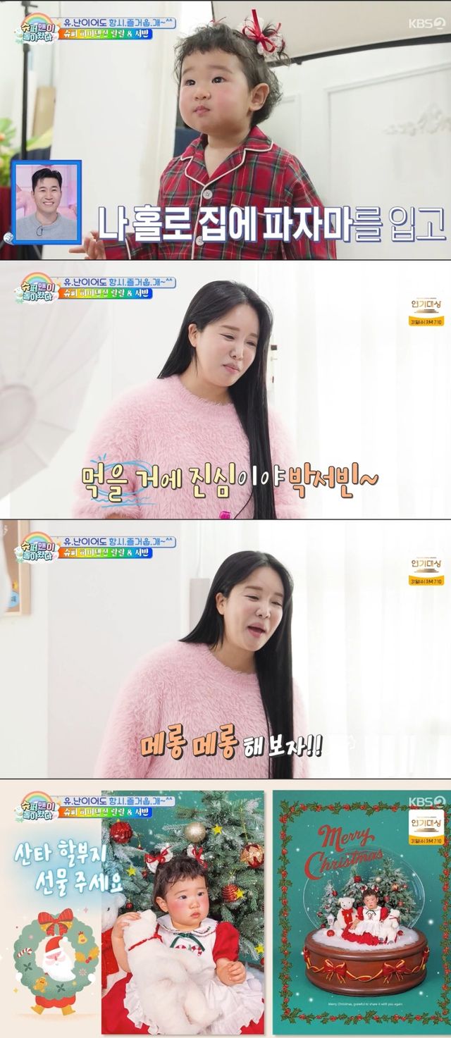 24일 방송된 KBS2 ‘슈퍼맨이 돌아왔다(이하 슈돌)’에서는 랄랄이 서빈이를 위해 특별한 크리스마스 촬영을 준비하는 모습이 공개됐다. 촬영이 시작되자 랄랄은 딸의 집중력을 끌어올리기 위해 직접 자신의 히트곡을 부르며 현장을 진두지휘했다.