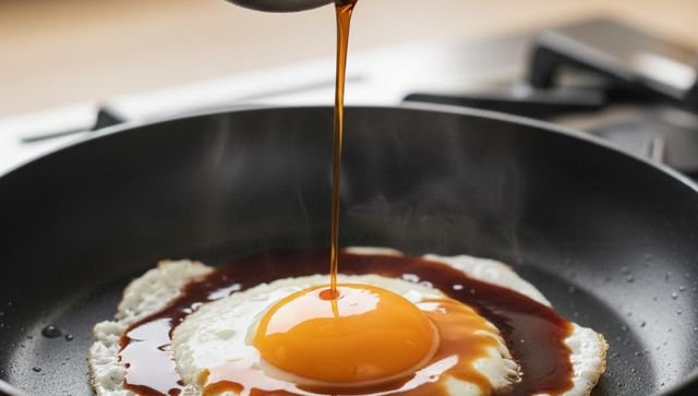 간장을 붓는 타이밍이 이 요리의 핵심이다. 계란 흰자가 거의 익고 노른자가 아직 반숙일 때, 간장을 팬 가장자리로 소량만 둘러준다. 계란 위에 직접 붓기보다는 뜨거운 팬에 닿게 흘려보내는 것이 좋다. 간장은 많을 필요가 없다. 밥과 함께 먹을 것을 고려하면 아주 적은 양으로도 충분히 간이 맞는다.