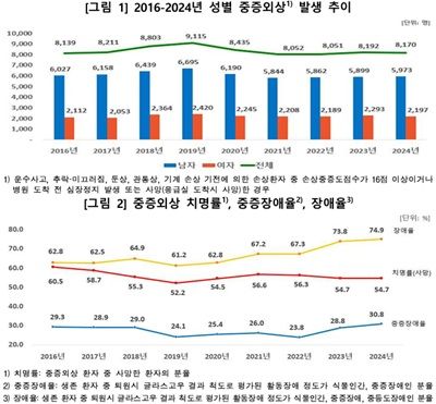 질병관리청이 지난 23일 발표한 ‘2024년 중증손상 및 다수사상 통계’에 따르면 중증외상 환자의 치명률은 54.7%로 2016년 60.5% 대비 감소했지만, 생존자 중 장애율은 74.9%로 지속적으로 증가해 생존 이후 치료 및 재활 정책 강화가 필요한 것으로 나타났다.