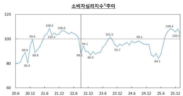한국은행 제주본부가 24일 발표한 '2025년 12월 제주지역 소비자동향조사 결과'에 따르면 이달 중 제주지역 소비자심리지수(CCSI)는 103.5로 전월(108.0)보다 4.5포인트(p) 하락했다. 지난달 반등 이후 한 달 만에 다시 하락 전환한 것으로, 전월 대비 낙폭은 비상계엄 사태가 발생한 지난해 12월(-8.4p) 이후 가장 컸다. 같은 기간 전국 소비자심리지수는 전월보다 2.5p 낮아진 109.9로, 제주 지수와의 격차는 더 벌어졌다.