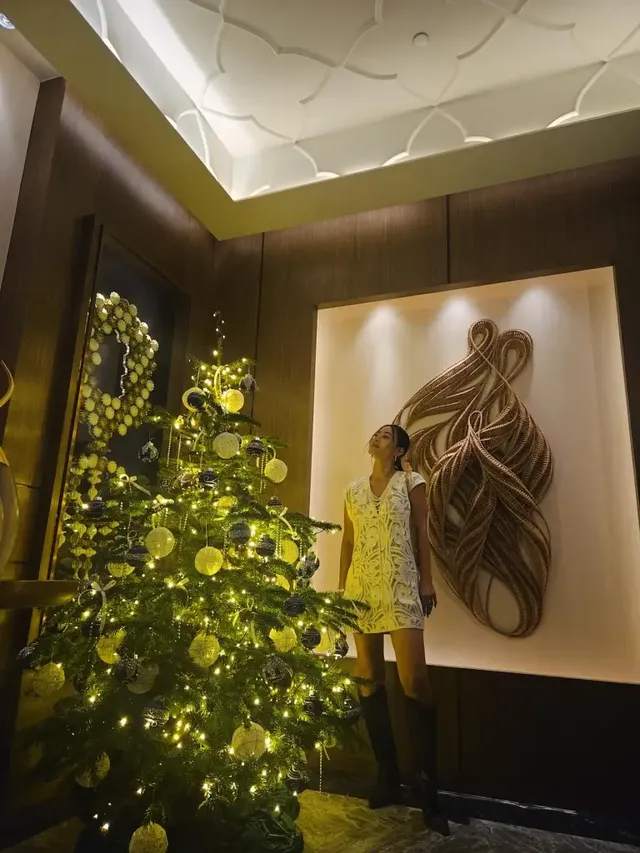 컬러 밸런스 측면에서도 황보의 선택은 영리하다. 크리스마스 트리와 황금빛 조명이 배경이 되는 상황에서 원색적인 레드나 그린을 피하고 무채색인 화이트와 블랙만을 선택함으로써 인물을 더욱 돋보이게 만드는 고립 효과를 유도했다. 조명의 웜톤과 화이트 드레스의 쿨톤이 만나 생성되는 오묘한 색감은 고급스러운 분위기를 연출하며, 드레스의 복잡한 텍스처는 별도의 액세서리 없이도 충분한 시각적 밀도를 제공한다. 여기에 자연스럽게 묶어 내린 헤어스타일과 절제된 메이크업은 의상의 디테일을 방해하지 않으면서도 세련된 도시 여성의 이미지를 구축한다.