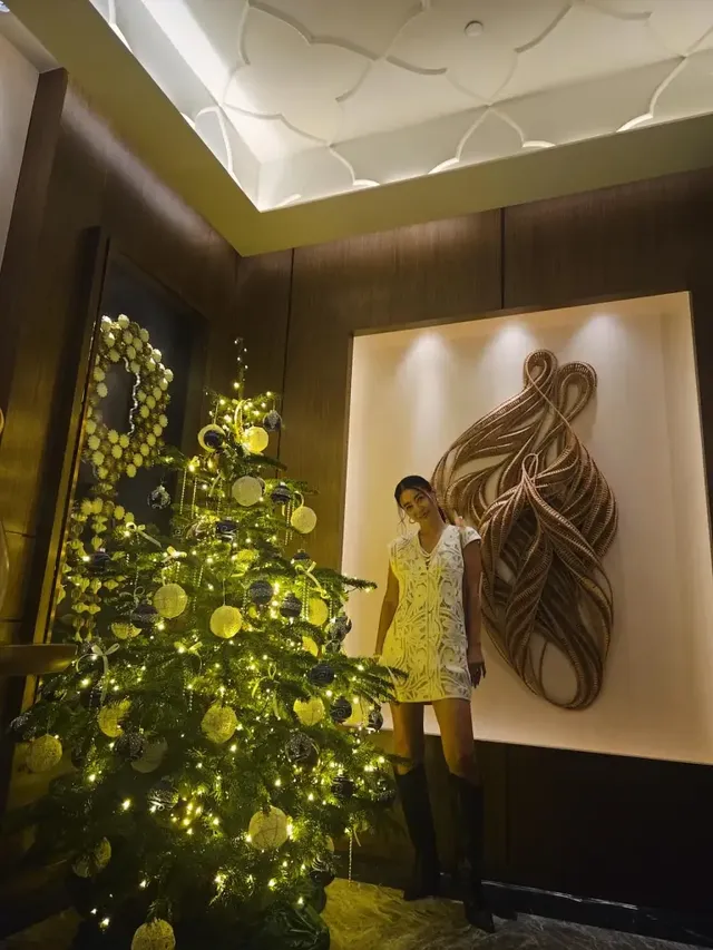 [Image 2] 크리스마스트리 옆에서 블랙 부츠와의 대비를 통해 명확한 스타일 포지셔닝을 보여주는 모습.