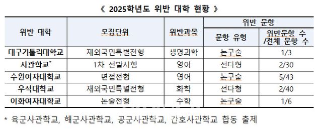 조사 결과 이화여대는 논술전형 중 수학 1문항이 고교 교육과정 범위를 벗어난 것으로 나타났다. 대구가톨릭대는 재외국민특별전형에서 생명과학 논·구술 시험 중 1문항이, 수원여대는 면접전형 영어 5문항, 우석대는 재외국민특별전형 선다형 시험 중 화학 2문항이 고교 교육과정을 넘어섰다. 사관학교에서도 1차 선발시험의 선다형 영어 시험 중 2문항이 고교 교육과정을 벗어났다.