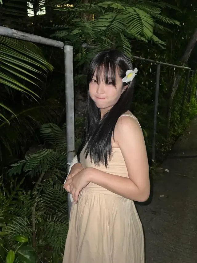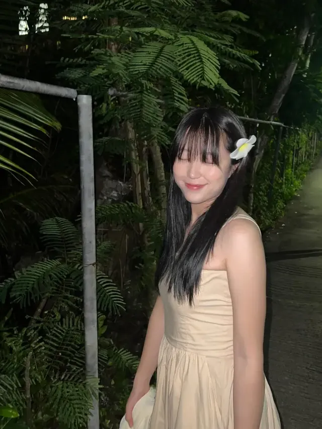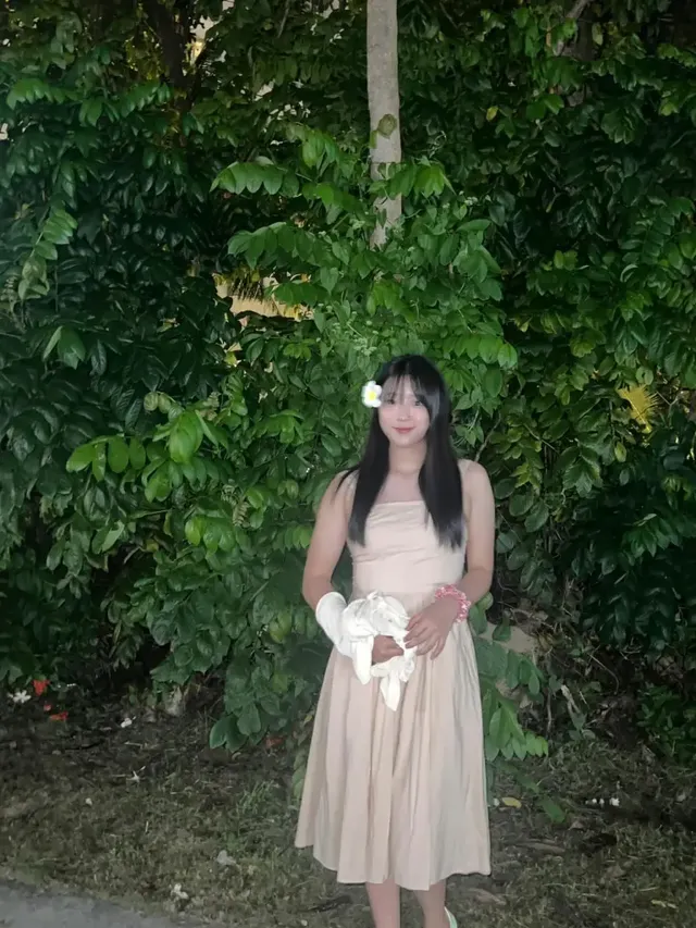컬러 밸런스 측면에서는 피부 톤과 자연스럽게 어우러지는 ‘샌드 베이지’를 메인으로 설정하여 시각적인 편안함과 확장감을 동시에 획득했다. 여기에 포인트 아이템으로 활용된 화이트 플라워 헤어 피스는 자칫 정적인 무드로 흐를 수 있는 코디에 휴양지의 여유로운 감성을 불어넣는 결정적인 역할을 한다. 왼쪽 귀 뒤편에 배치된 볼륨감 있는 꽃 장식은 시선을 상단으로 유도하여 얼굴 윤곽을 더욱 입체적으로 보이게 하며, 흑발의 긴 생머리와 대비를 이루어 청초한 이미지를 극대화한다. 손목에 착용된 핑크 톤의 체크 패턴 스크런치와 화이트 아우터를 가볍게 쥔 연출은 자칫 경직될 수 있는 포멀한 원피스 룩에 일상적인 친근함과 경쾌한 리듬감을 부여하는 영리한 스타일링 팁이다.