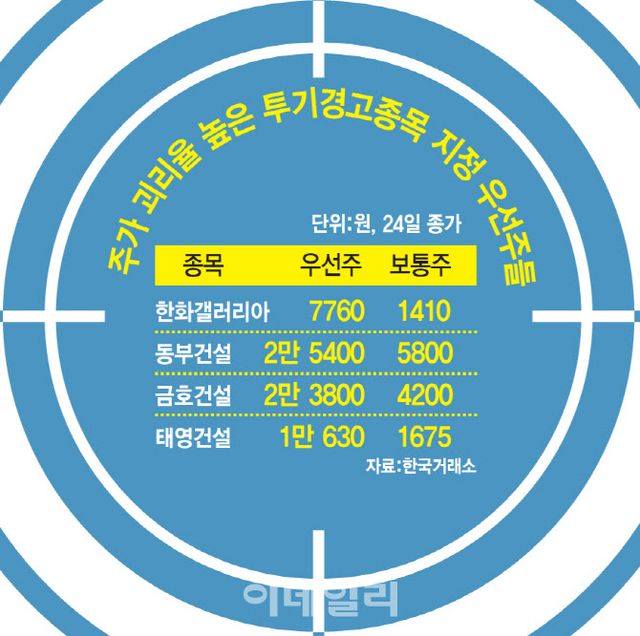 동부건설우(005965), 금호건설우(002995), 태영건설우(009415)도 보통주와의 가격 격차가 5.5~6.3배까지 확대, 투자경고종목으로 지정된 상태다.
