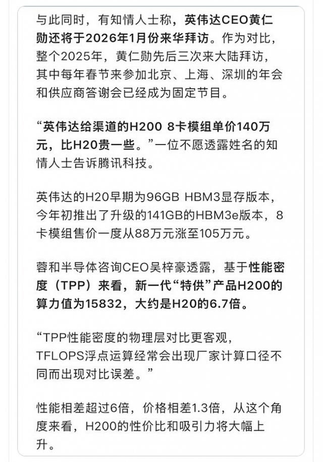 중국 현지 매체들은 H200 AI 칩 8개로 구성된 클러스터 가격이 약 20만 달러 수준이 될 것이라고 전했다. 이는 기존 중국 수출용 H20 구성과 거의 비슷한 가격대다. 문제는 성능이다. H200은 사양상 H20 대비 최대 6배 이상의 성능 차이가 예상되는 만큼, 가격 대비 성능에서 매우 강력한 선택지가 된다.