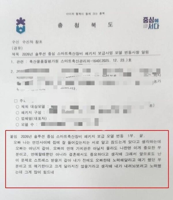 뉴시스 보도에 따르면, 26일 온라인 커뮤니티 등에 따르면 문제가 된 공문 제목은 '2026년 솔루션 중심 스마트 축산장비 패키지 보급 사업 모델 변동 사항 알림'으로, 지난 23일 도내 시·군 축산 관련 부서에 배포됐다.