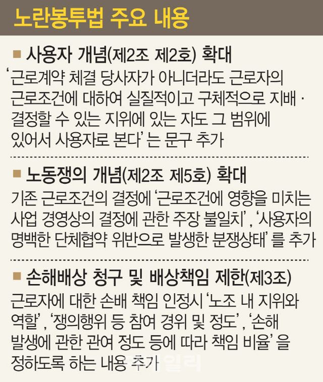 노동부는 확대된 ‘사용자’의 범위를 △근로조건에 대한 구조적 통제 △조직적 사업 편입 및 경제적 종속성 △근로조건별 사용자성 인정 등으로 구체화했다. 개정 노조법에 따라 근로계약을 체결한 당사자가 아니어도 근로조건에 대해 실질적이고 구체적으로 지배·결정할 수 있는 지위에 있는 사람도 사용자로 인정된다. 이 경우 하청노조가 원청 사용자를 대상으로 교섭을 요구할 수 있게 되는 것이다.