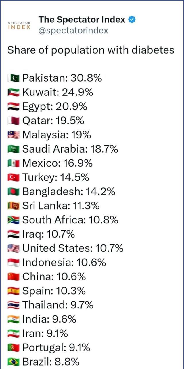 스펙테이터 인덱스가 공개한 국가별 당뇨 유병률 자료에 따르면 파키스탄의 당뇨병 유병률은 30.8%로 압도적 1위다. 쿠웨이트가 24.9%, 이집트가 20.9%, 카타르가 19.5%로 뒤를 잇는다. 말레이시아(19%), 사우디아라비아(18.7%), 멕시코(16.9%), 터키(14.5%)도 높은 수치를 보인다. 미국은 10.7%로 13위, 중국은 10.6%로 15위다.