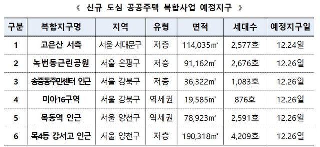 이번에 지정 공고된 곳은 △목동역 인근 △목4동 강서고 △고은산 서측 △녹번동 근린공원 △송중동 주민센터 인근 △미아16 등 총 6곳이다. 전체 면적은 53만 345㎡ 규모, 1만 4012가구에 달한다.