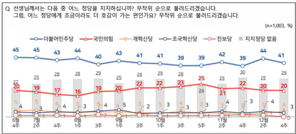 엠브레인퍼블릭·케이스탯리서치·코리아리서치·한국리서치가 지난 22∼24일 만 18세 이상 남녀 1003명을 대상으로 진행한 전국지표조사(NBS)에서 정당 지지율 조사를 실시한 결과 민주당 41%, 국민의힘 20%, 개혁신당 4%, 조국혁신당 3% 등으로 나타났다.