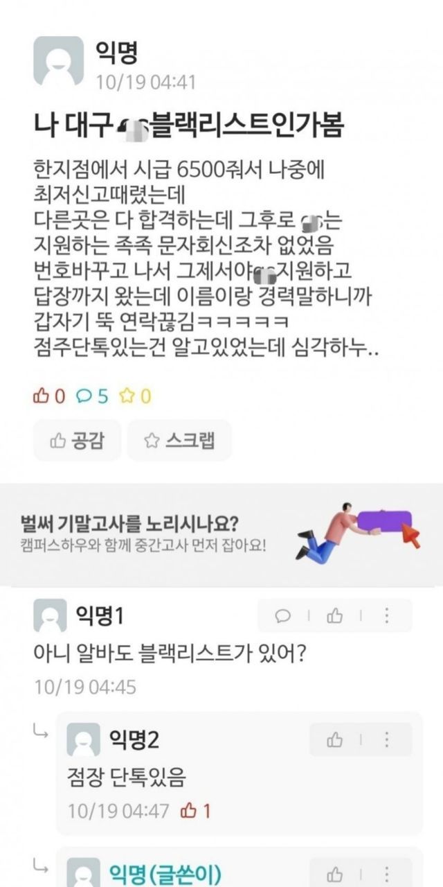 제이켠이 취업 후 직장인 커뮤니티에 남긴 글