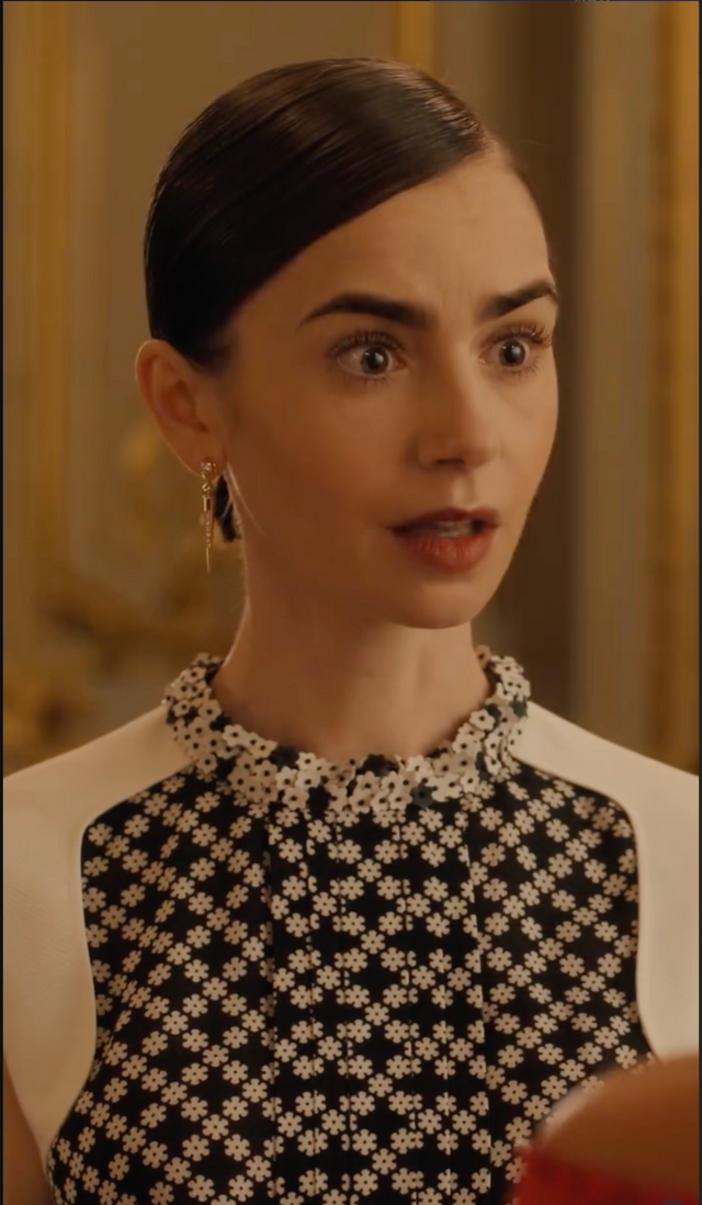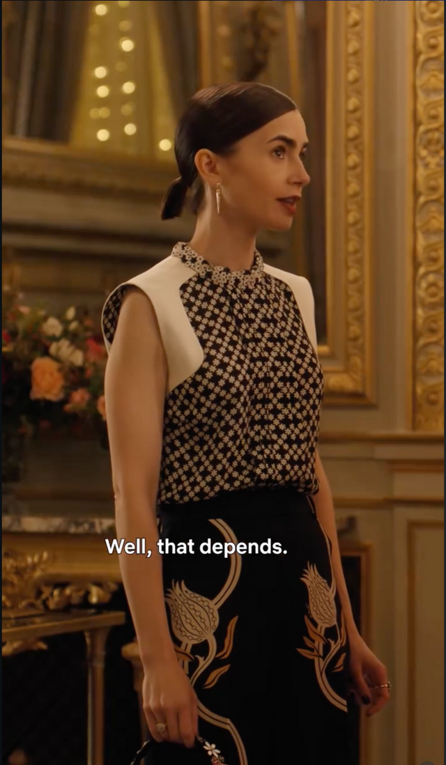 〈에밀리, 파리에 가다〉 시즌 5의 핵심 키워드인 성숙, 절제, 지적 우아함을 가장 명확하게 구현한 룩이 아닐까. 구조적 디테일과 플로럴 패턴이 어우러진 하이넥 블라우스에 오리엔탈 무드의 팬츠를 매칭해, 한층 성장한 에밀리의 내적 변화를 시각적으로 드러낸다. 슬릭한 로우 포니테일과 최소화한 액세서리 선택은 스타일링의 완성도를 높이며, ‘패션을 사랑하는 인물’에서 나아가 ‘패션을 이해하고 활용하는 인물’로 진화한 에밀리의 현재를 보여준다.
