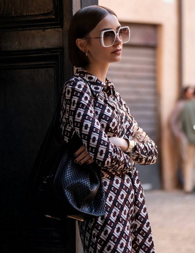이탈리아 영화 황금기, 1950~60년대를 풍미한 스크린 스타들을 연상시키는 Diane von Furstenberg의 미쉘 점프수트. 클래식한 패턴과 유려한 실루엣이 어우러진 이 룩은 에밀리 쿠퍼의 스타일에 고전적 우아함을 더하며, 로마의 낭만과 시네마틱 무드를 완성했다.