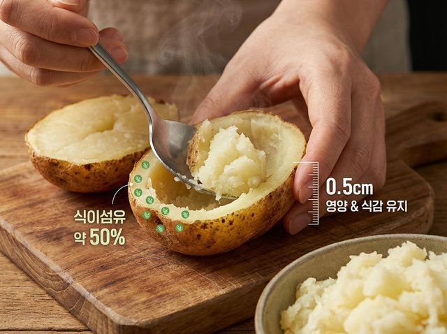 구워진 감자는 반으로 자른 뒤 숟가락으로 속을 파낸다. 이때 껍질 안쪽에 감자를 약 0.5cm 정도 남겨야 부서지지 않는다. 너무 얇게 파내면 2차 굽기 과정에서 형태가 무너지기 쉽다. 파낸 감자 속은 버리지 않는다. 버터, 사워크림, 치즈, 쪽파를 섞어 으깬 감자로 활용하면 다음 날 반찬이나 샌드위치 속 재료로 쓸 수 있다.