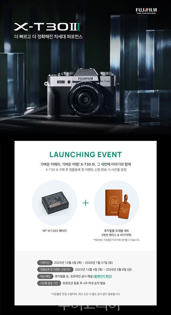 한편, ‘X-T30 III’ 정식 출시를 기념하는 론칭 프로모션을 실시한다. 내년 1월 31일까지 X-T30 III 구매 후 2월 6일까지 정품 등록 및 이벤트 신청을 완료한 고객들을 대상으로 정품 배터리(NP-W126S)와 함께 여권 케이스, 러기지택으로 구성된 트래블 세트를 증정한다.