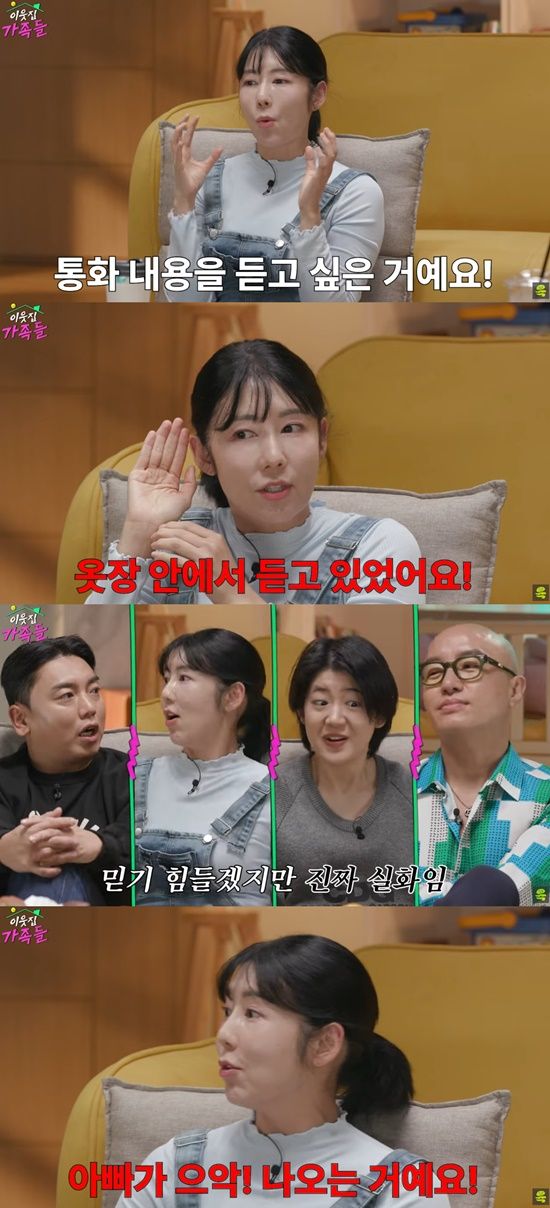 사유리는 “저는 사춘기 때 남자랑 통화할 수 있지 않냐. 근데 우리 아빠는 통화하는 내용이 듣고 싶었던 거다”라며 “옷장에 들어가서 들었던 거다. 뭔가 소리가 나서 열어봤더니 아빠가 나오더라”라고 당혹스러웠던 경험을 고백했다.