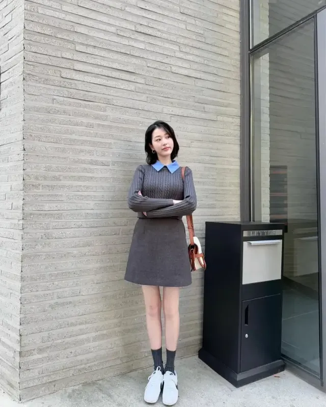 하의로 매치한 그레이 미니스커트는 상·하의를 동일 계열 컬러로 묶어 세로 실루엣을 강조한다. 허리선이 과하게 높지 않아 자연스러운 비율을 형성하고, A라인에 가까운 미묘한 플레어가 허벅지 라인을 부드럽게 커버한다. 니트의 텍스처와 스커트의 매끈한 소재 대비는 전체 룩에 리듬감을 부여하며, 다리 라인을 과도하게 드러내지 않으면서도 경쾌한 인상을 완성한다. 여기에 블랙 삭스와 화이트 스니커즈 조합은 클래식한 겨울 아이템 속에 캐주얼한 숨을 불어넣는다.