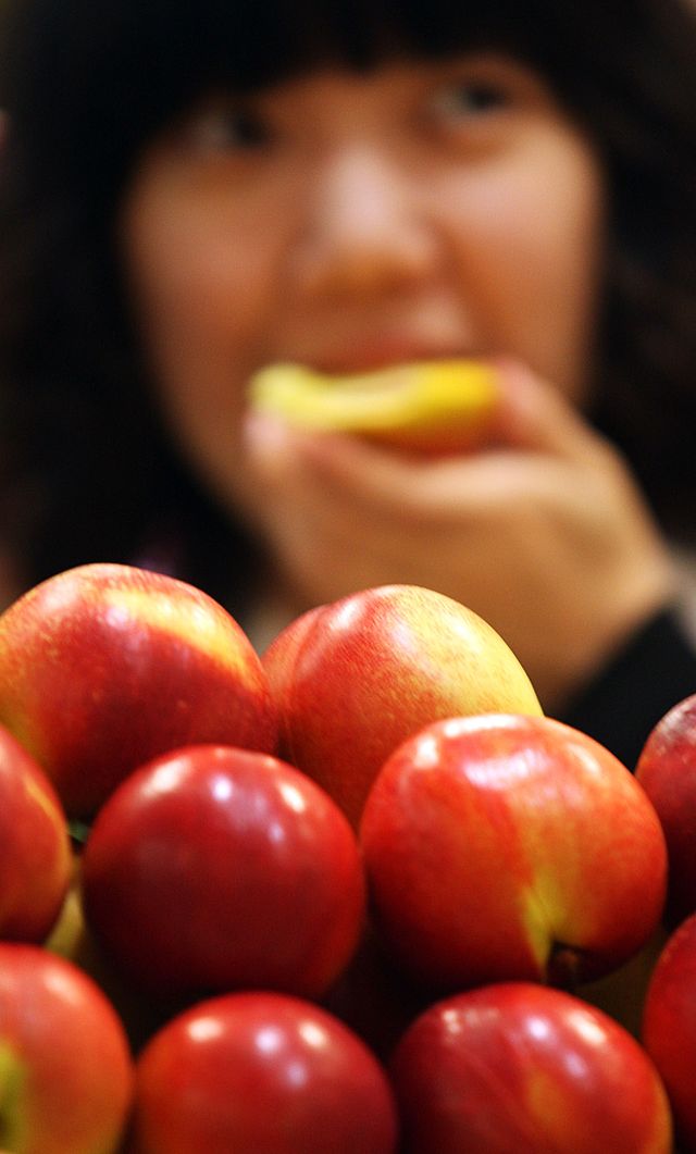 겉면에 털이 없고 매끈한 모양새. 일반 복숭아보다 과육이 단단하며 새콤달콤한 맛이 일품인 천도계 복숭아는 경산이 국내 주산지다.