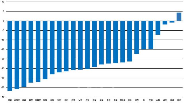 최근 서울 아파트 매물 증감률 통계는 현재 시장의 구조를 비교적 명확하게 드러낸다. 아실 자료를 보면(10.15 대책이후 12.24일까지) 성북구(-37%), 서대문구(-36%), 강서구(-35%), 마포구(-33%), 동대문구(-32%) 등 다수의 자치구에서 아파트 매물이 30% 안팎으로 감소했다. 이는 단기간의 변동이라기보다, 서울 전반에 걸친 공통된 흐름으로 해석할 수 있다.