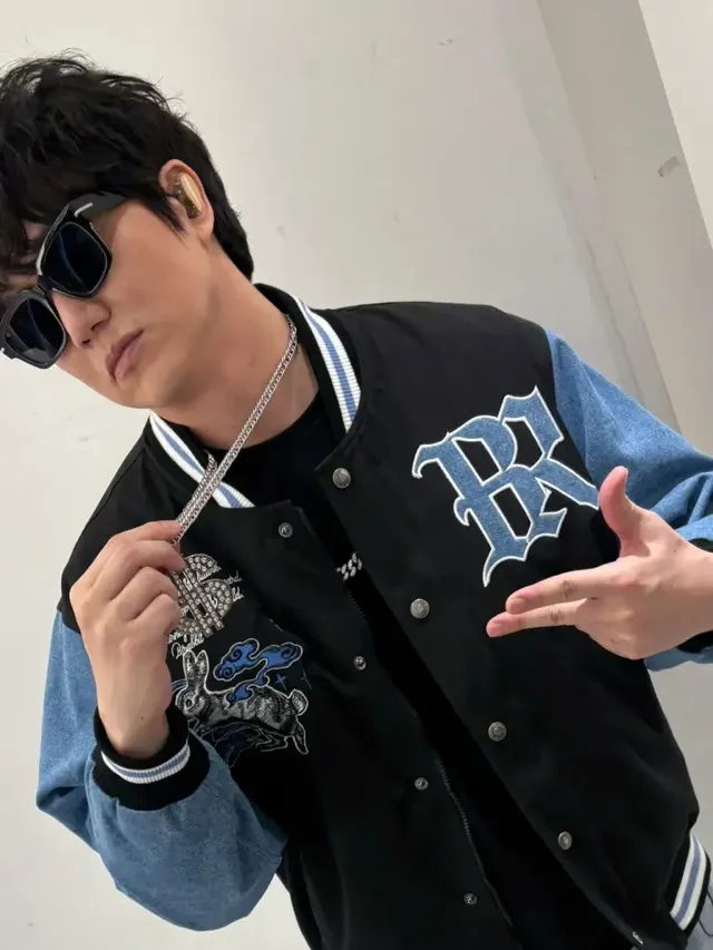 다른 컷에서는 분위기가 명확히 전환된다. 블랙 바시티 재킷에 데님 슬리브를 결합한 스트리트 요소는 컬러 대비를 통해 즉각적인 시선을 끌어낸다. 가슴의 대형 레터링과 자수 패치가 중심 포인트가 되지만, 블랙 바디와 블루 데님이라는 제한된 색 구성 덕분에 시각적 소음은 억제된다. 체인 네크리스와 선글라스는 광택과 질감을 추가해 상체에 리듬을 부여하되, 과도한 레이어링을 피함으로써 성숙한 스트리트 스타일로 귀결된다. 어깨와 소매의 소재 전환은 팔 라인을 강조해 활동성을 드러내고, 재킷의 크롭되지 않은 기장은 상체가 짧아 보이는 위험을 회피한다. 동일 인물이 미니멀과 스트리트를 오가며도 일관된 이미지 밀도를 유지하는 점이 인상적이다.