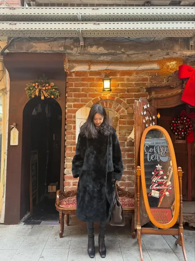 세 번째 이미지는 공간과 스타일의 조합이 이미지에 어떤 깊이를 더하는지를 보여준다. 벽돌 질감의 외벽과 빈티지한 소품을 배경으로 선택한 블랙 퍼 롱 코트는 클래식한 겨울 아우터의 정수를 드러낸다. 무릎 아래로 내려오는 기장과 일자로 떨어지는 실루엣은 체형을 세로로 정리하며, 하체를 슬림하게 보이도록 설계됐다. 여기에 미니멀한 블랙 부츠와 구조적인 백을 매치해 장식 요소를 최소화하고, 소재 자체의 힘에 집중한 스타일링이 완성된다. 퍼의 윤기와 매트한 하의의 대비는 전체 룩에 깊이를 더하며, 과하지 않은 럭셔리 무드를 형성한다.